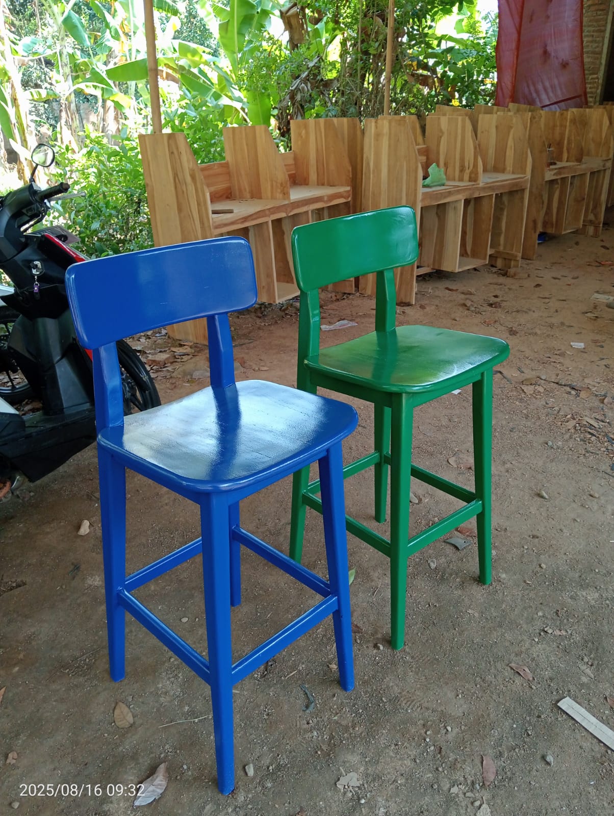 Kursi bar ini menampilkan desain minimalis dan modern, dengan sandaran punggung yang nyaman dan tempat duduk yang solid. Finishing cat duco memberikan tampilan yang halus, rapi, dan cerah, serta melindungi kayu dari kelembapan dan noda, membuatnya mudah dibersihkan dan tahan lama.