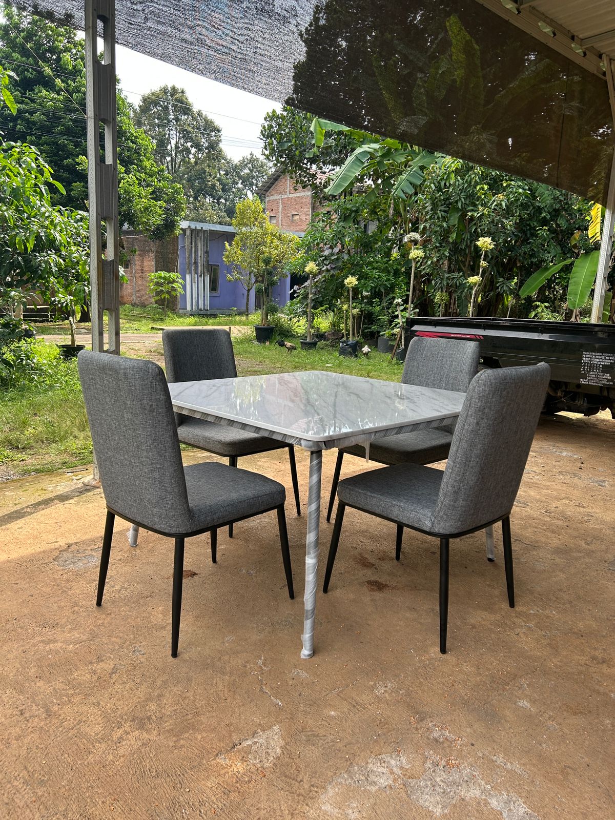 Rangka meja terbuat dari besi hollow 3×3 cm yang dipadukan dengan kaki pipa besi 1,5 inch, menjadikan meja stabil dan tahan lama untuk penggunaan jangka panjang. Set ini dilengkapi 4 kursi empuk dengan desain simpel dan nyaman, sangat ideal untuk makan bersama keluarga atau tamu.